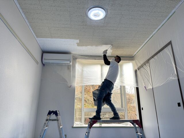 まずは天井の塗装工事から。しっかり養生をしてから塗っていきます。