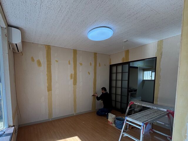 天井の塗装が終わったら、続いて壁のクロス貼替です。パテで下地処理を行います。