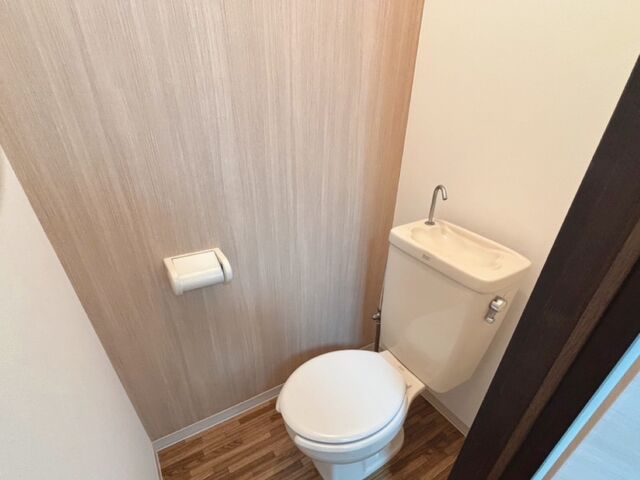 トイレのクロスは一面を木目調のアクセントクロスで。便座取替も行いました。